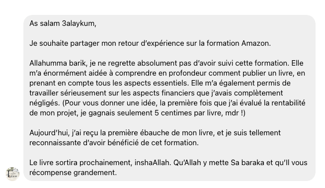 À la fin du programme, tu auras compris comment faire un livre à fort potentiel, qui ait des probabilités élevées de se vendre. Tu auras publié ton premier livre, et tu pourras commencer à toucher tes premières royalties inchallah.